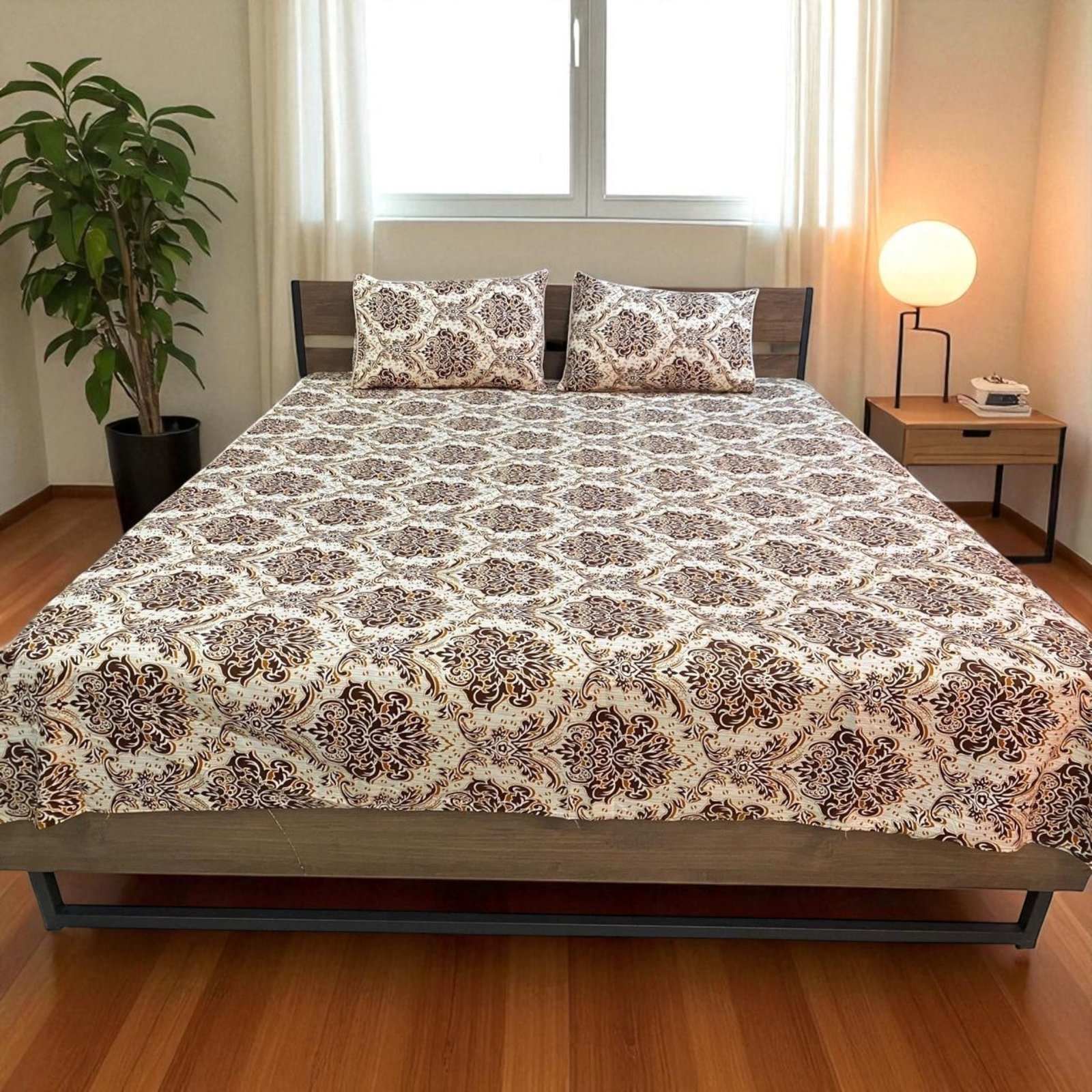 3 Pcs Cotton Satin Double Bed Sheet – Printed Brown