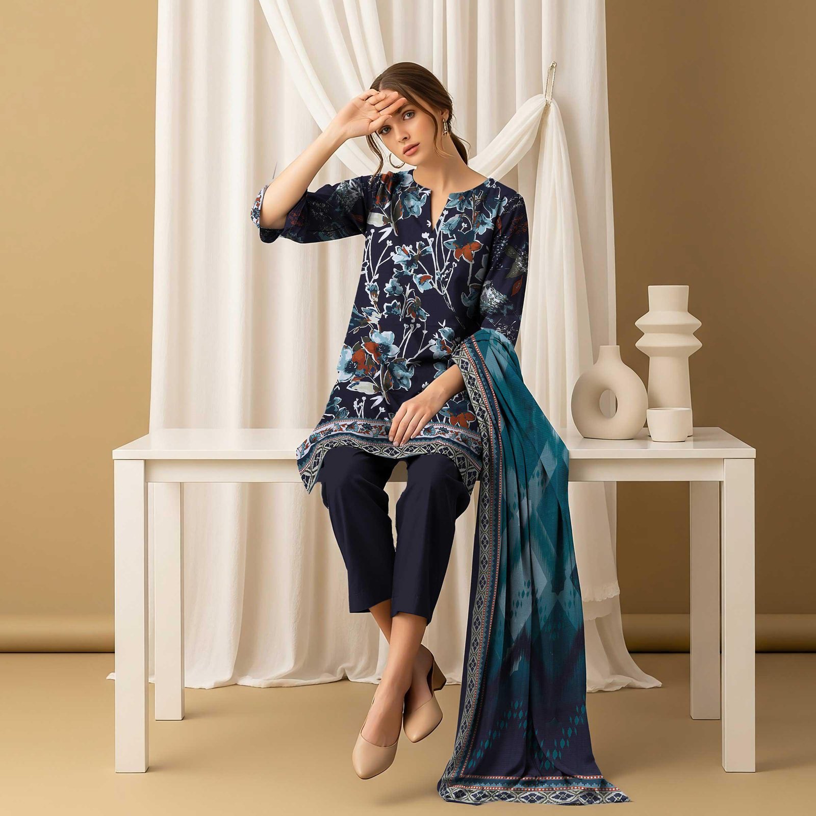 3 Piece Digital Print Elegant Linen – Unstitched Dark Blue